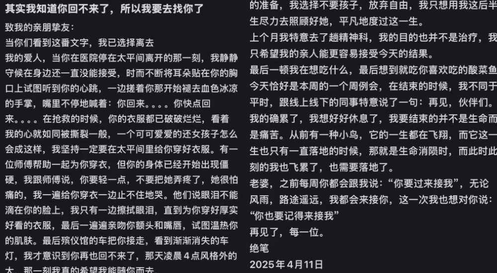 据网传信息,4月11日,该网友发文,“当你们看到这番文字,我已选择离去”。文中,他详细地描述了他的“爱人”在医院太平间的情景。