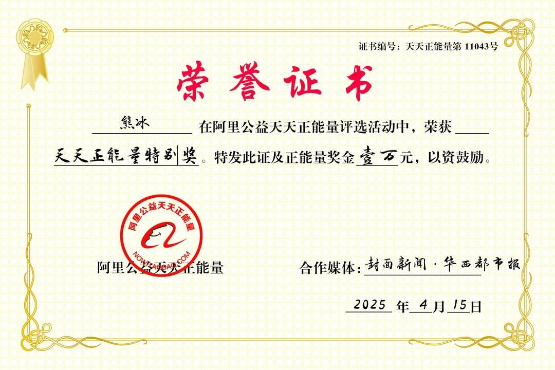 4月15日,阿里公益天天正能量联合封面新闻·华西都市报,为熊冰颁发正能量特别奖,决定给他发放10000元奖金,为他这份见义勇为的义举点赞。