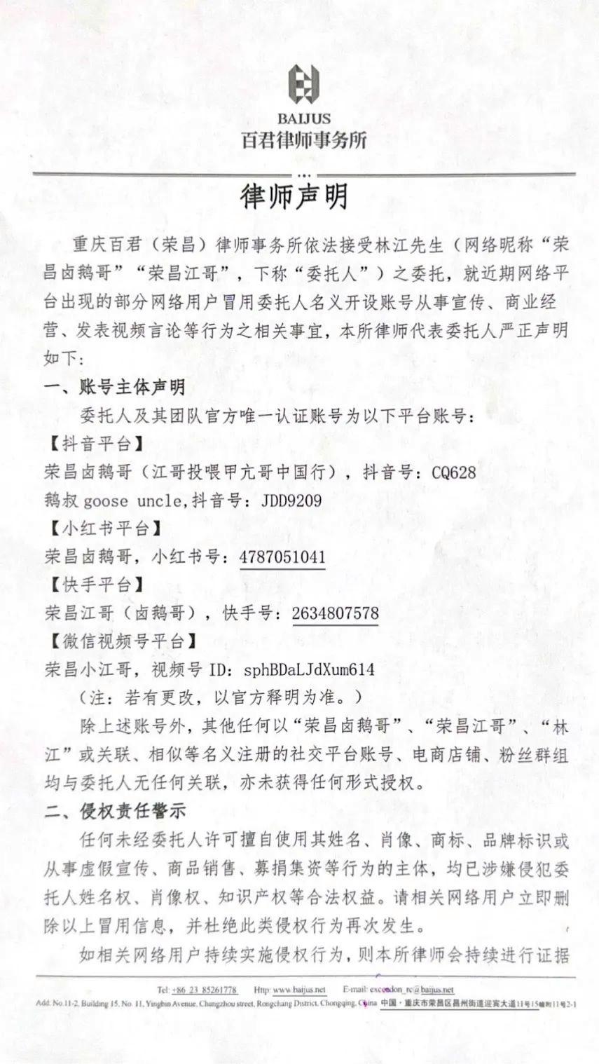 紧急“打假”!“荣昌卤鹅哥”发布律师声明