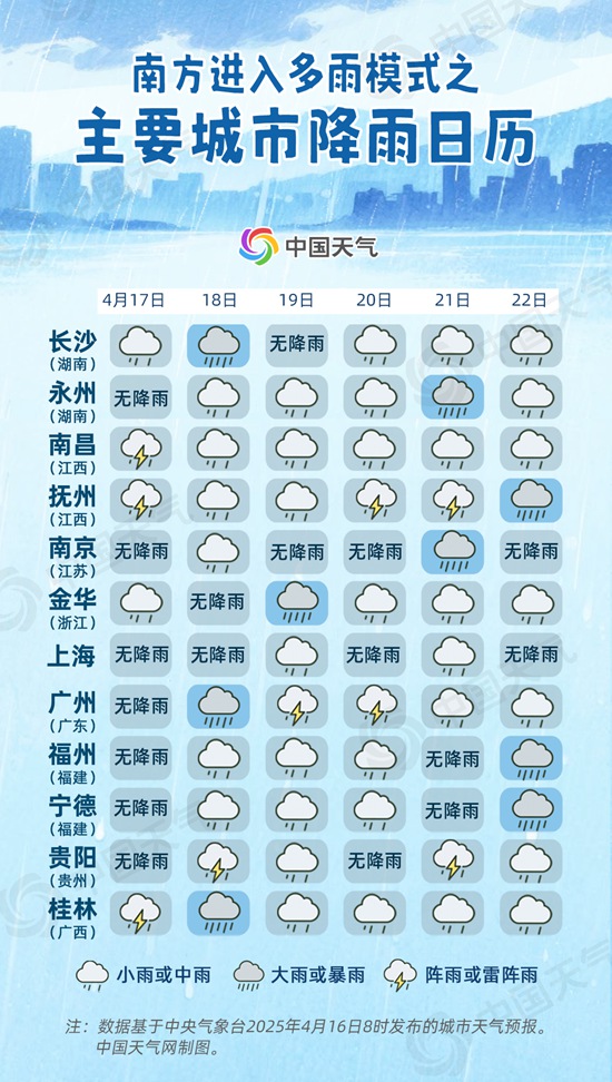 南方雨水短暂“休整”后,今天(4月16日)起又将开启“雨纷纷”模式。未来六天,南方地区会有三次降雨过程接连来袭,持续时间长、影响范围广,降雨强度和对流性天气呈现增多增强趋势。中国天气网推出主要城市降雨日历,看哪些地方雨水将全勤“打卡”。