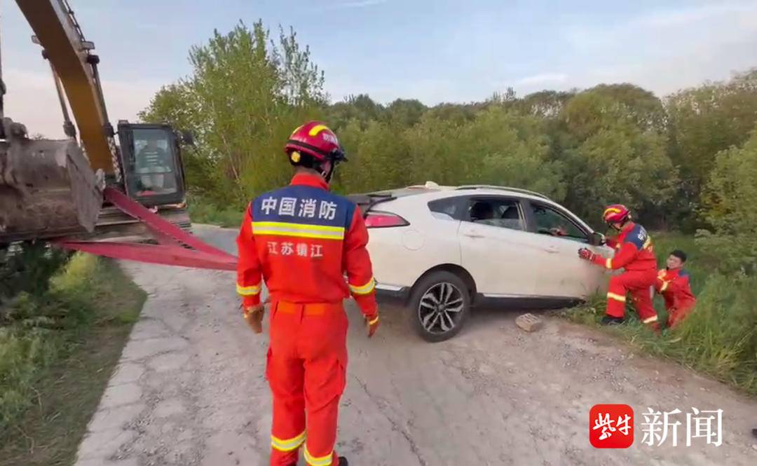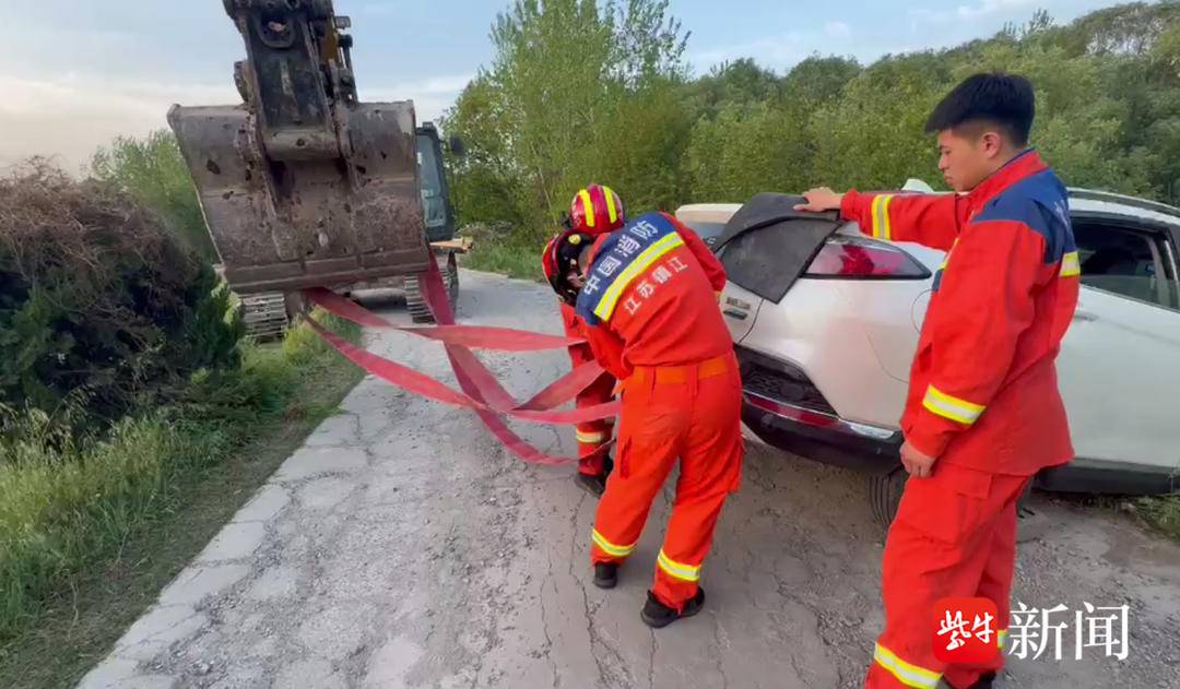 消防人员到达现场,发现一辆轿车车头朝下,陷入路边江堤,车身倾斜,一半车身在马路上。当时,司机被困在驾驶室内,由于担心下车会导致车辆失去平衡而不敢动弹。消防人员了解到,江堤正在维修,附近有挖土机,便立即联系调派挖土机前来支援。