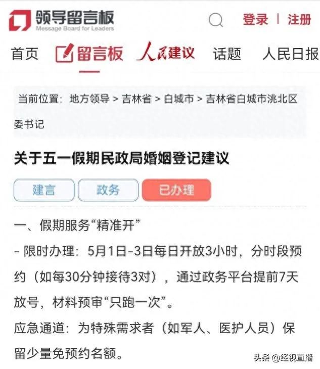 今年3月,吉林省白城市有网友在当地领导留言板平台建言,希望五一假期,民政局开放婚姻登记,并且给出了具体方案:5月1日 - 3日每天开放3小时,实行分时段预约,比如每30分钟接待3对新人,通过政务平台提前7天放号,并且提前预审材料,实现“只跑一次”,同时为军人、医护人员等特殊需求者保留少量免预约名额。五一将至,该留言引发关注。