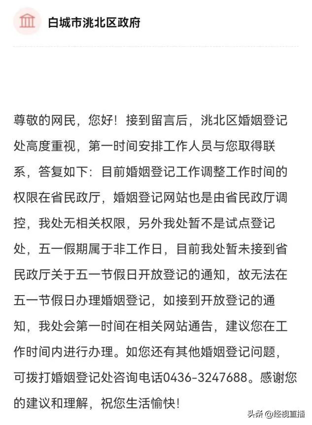 随后,白城市洮北区政府书面答复,目前调整婚姻登记工作时间的权限在省民政厅,当地暂未接到省民政厅关于五一节假日开放登记的通知,一旦接到通知,会第一时间在相关网站通告。