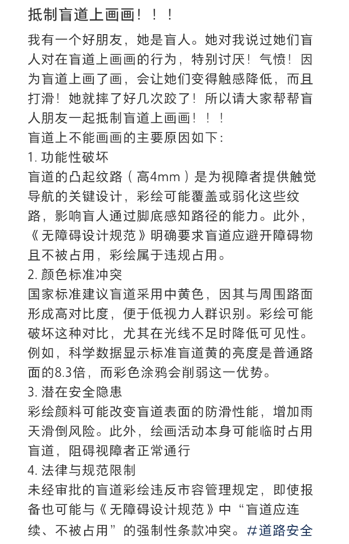 该网友还列举了盲道上不能画画的原因,包括功能性破坏,颜色标准冲突以及潜在安全隐患。