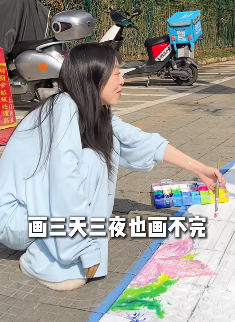 独臂女孩在丽水人行道上绘制的“彩虹盲道”。网络截图。