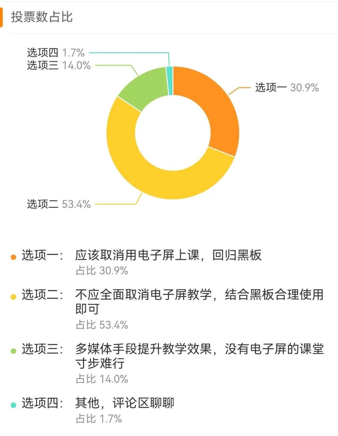 看丹观察注意到,一项2829人参与的名为“学校是否应该取消电子屏教学”的投票显示,53.4%的网友认为“不应全面取消电子屏教学,结合黑板合理使用即可”,30.9%的网友认为“应该取消用电子屏上课,回归黑板”,14%的网友选择“多媒体手段提升教学效果,没有电子屏的课堂寸步难行”。