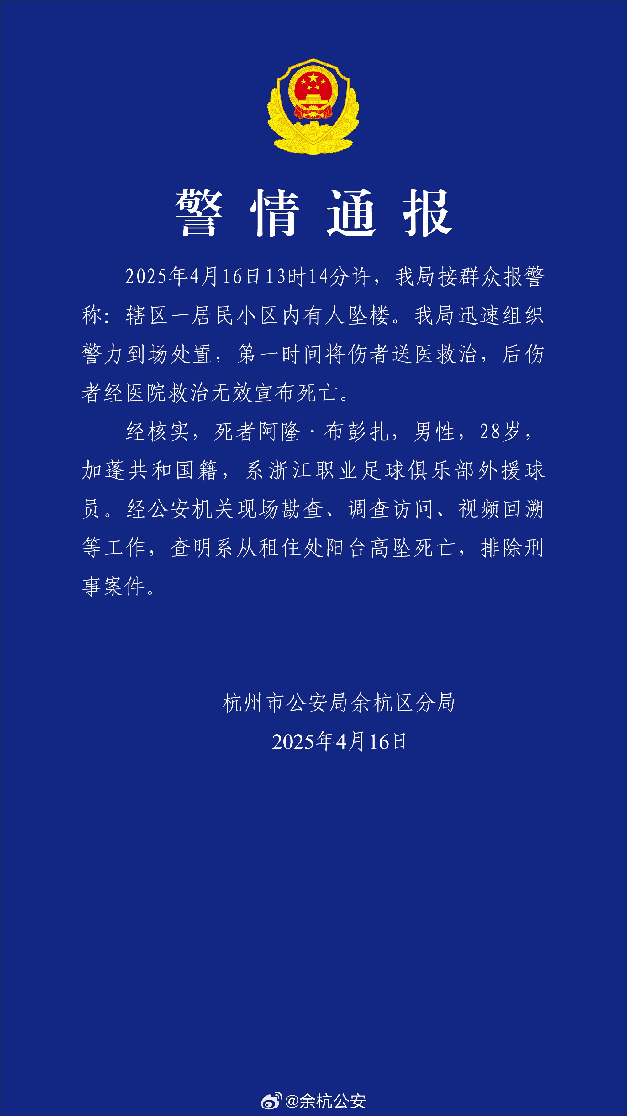 余杭公安:布彭扎查明系从租住处阳台高坠死亡,排除刑事案件
