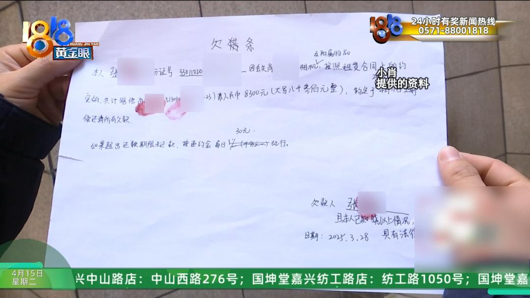 飞来峰海拔168米,游人如织,景区管理服务也很到位,小肖表示当时她对这个说法半信半疑,但又难以验证,而且对方态度显得挺诚恳,写了一张“欠条”,说是因丢失小肖的相机及附属物品,按照租赁合同上所约定的,共计赔偿人民币8300元于今年4月11号之前还清所有欠款。
