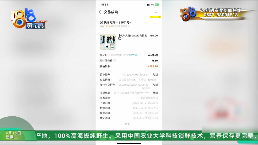 小王说她有一台二手买来的大疆Pocket 3,花了三千七左右,3月21号她挂到“闲鱼”平台上出租,一个叫“亚洲机智的小孩”的用户下了单,租期两周,成交价300元,约好当晚自提。