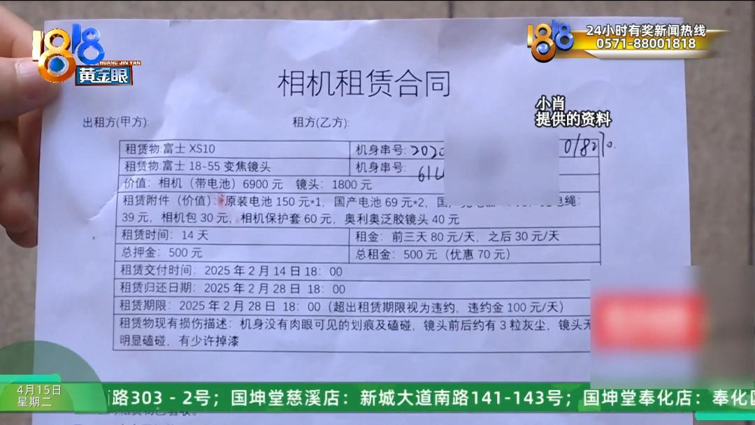 采访时陆续有人赶来,都说是被同一个人租了东西没还,小肖姑娘手里有相机租赁合同,租赁物是富士X-S10和18-55变焦镜头,租期14天,2月14号到2月28号,租金和押金各五百块钱。