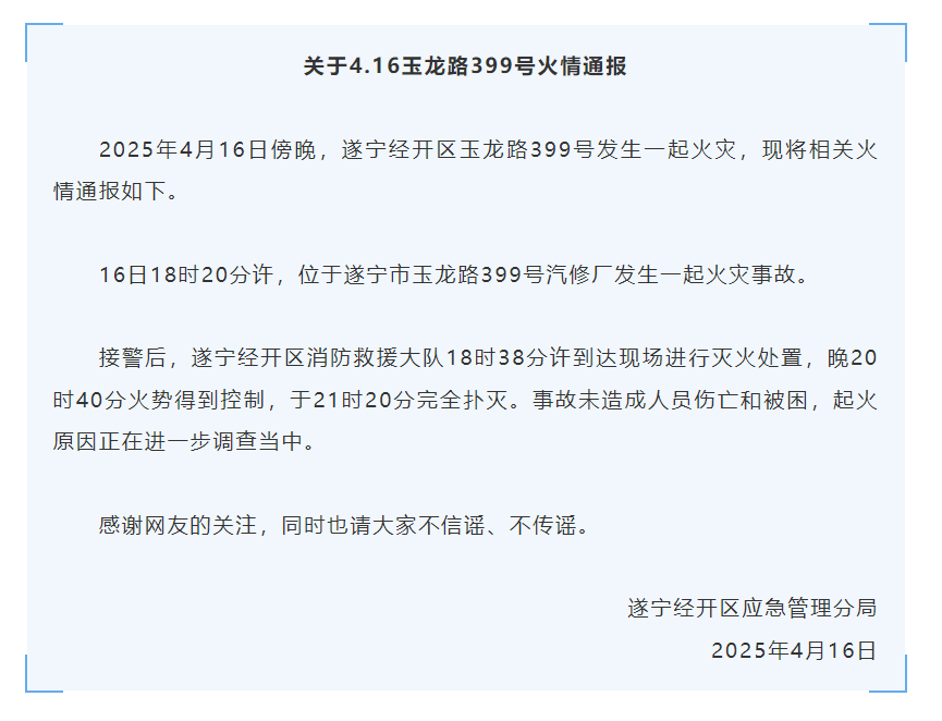 2025年4月16日傍晚,遂宁经开区玉龙路399号发生一起火灾,现将相关火情通报如下。