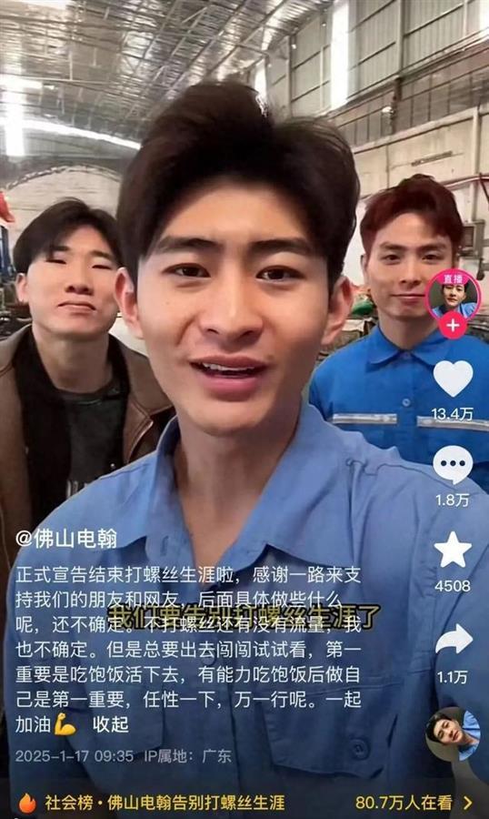 2025年1月17日,网红“佛山电翰”发视频称,要结束打螺丝生涯了,对于未来规划,“佛山电翰”表示还不确定,但是总归要出去闯闯试试看。他表示:“现在心态变化了,其他收入多了,又还在打螺丝,直播的时候就感觉在作秀嘛。同时,我也不想消耗工人这个身份。”