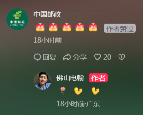随后,广东邮政邮惠达账号也发布了相关内容,中国邮政官方账号在其评论区发布了“加油”的表情包为其打call。