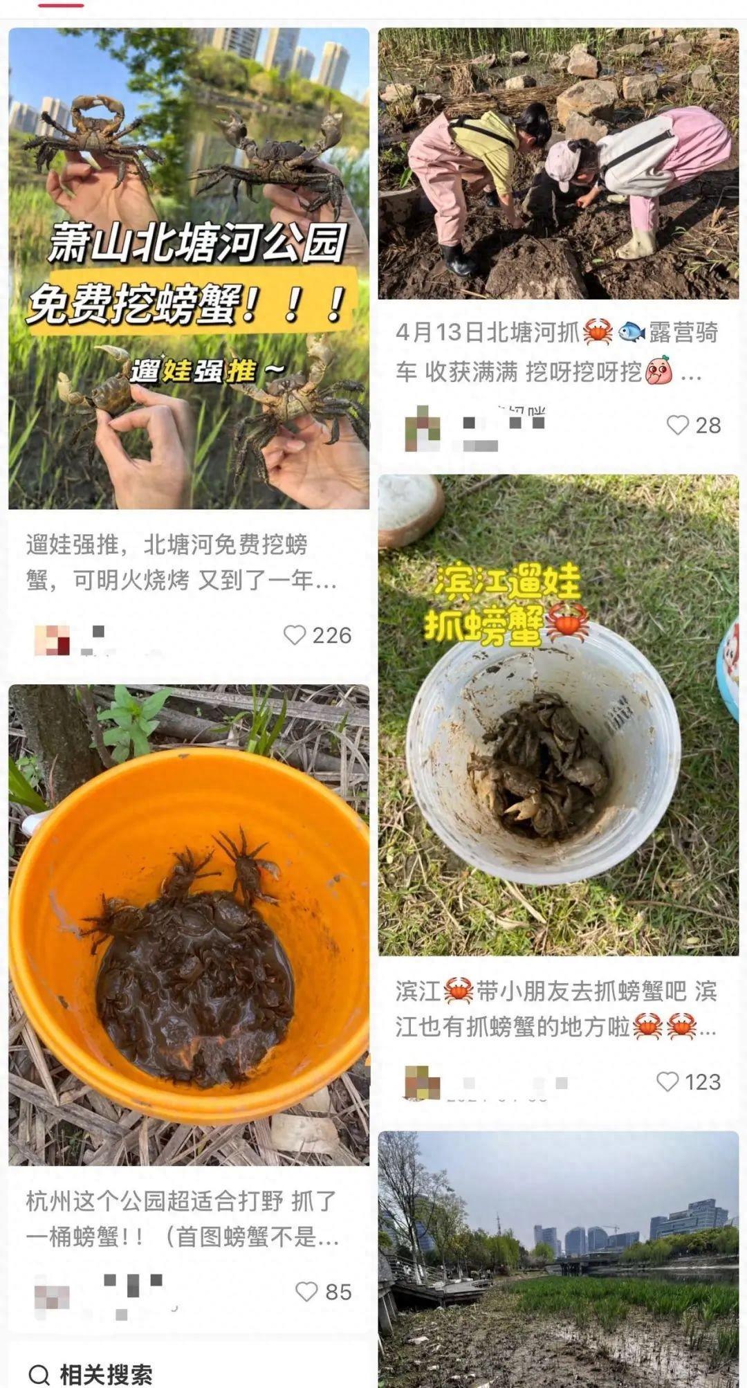 最近,一股“亲子挖蟹风”在社交平台上兴起,不少网友晒出在杭州北塘河沿岸的丰硕“战果”——小桶里大小不一的螃蟹挥舞着钳子,孩子们蹲在泥滩上兴奋尖叫。