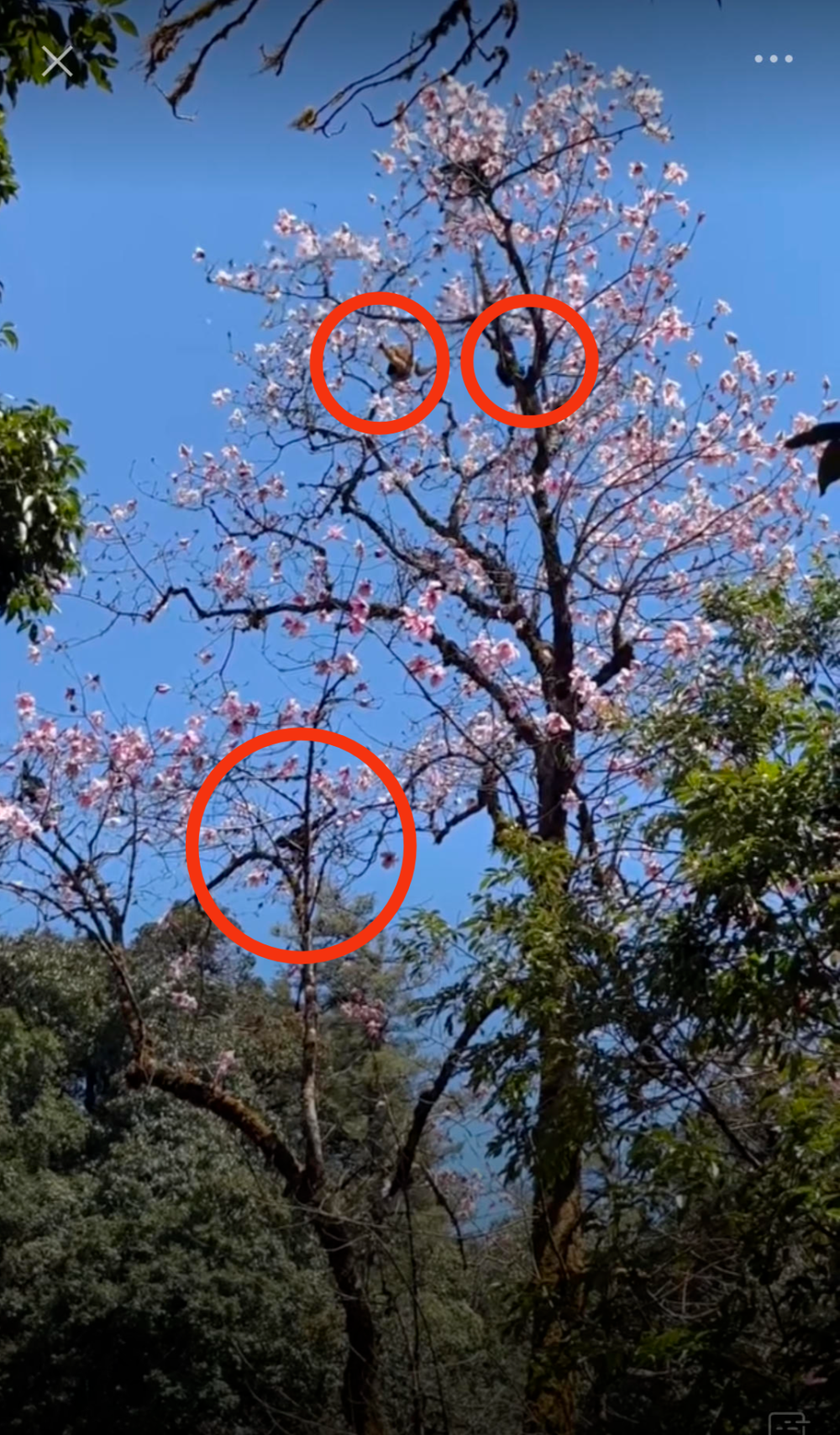 ▲画面中,上方左侧红圈处为长臂猿家庭中的母亲,右侧为儿子,下方为父亲。云南哀牢山国家级自然保护区楚雄管护局供图