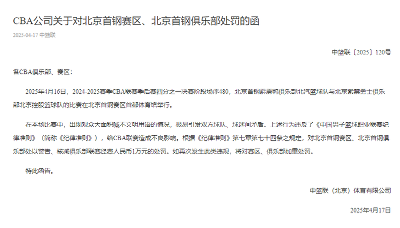 新京报讯4月17日,CBA公司发布关于对北京首钢赛区、北京首钢俱乐部处罚的函,全文如下: