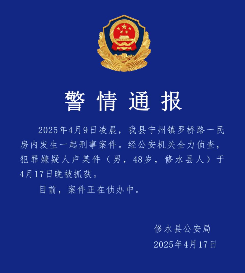 4月17日晚,江西省九江市修水县公安局通报:4月9日凌晨,我县宁州镇罗桥路一民房内发生一起刑事案件。经公安机关全力侦查,犯罪嫌疑人卢某件(男,48岁,修水县人)于4月17日晚被抓获。目前,案件正在侦办中。