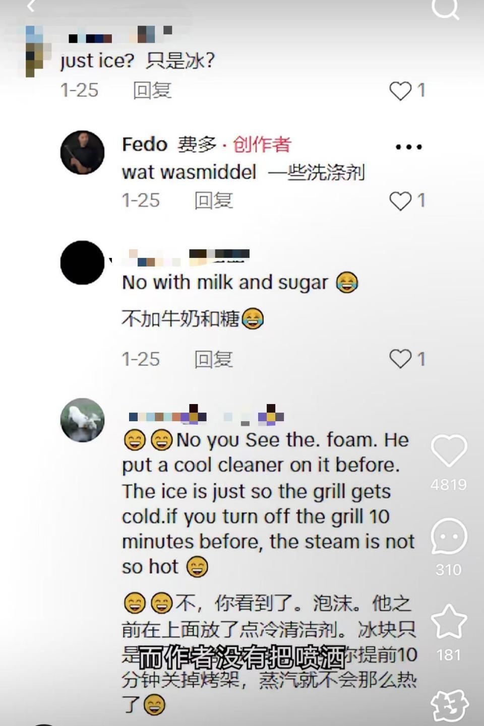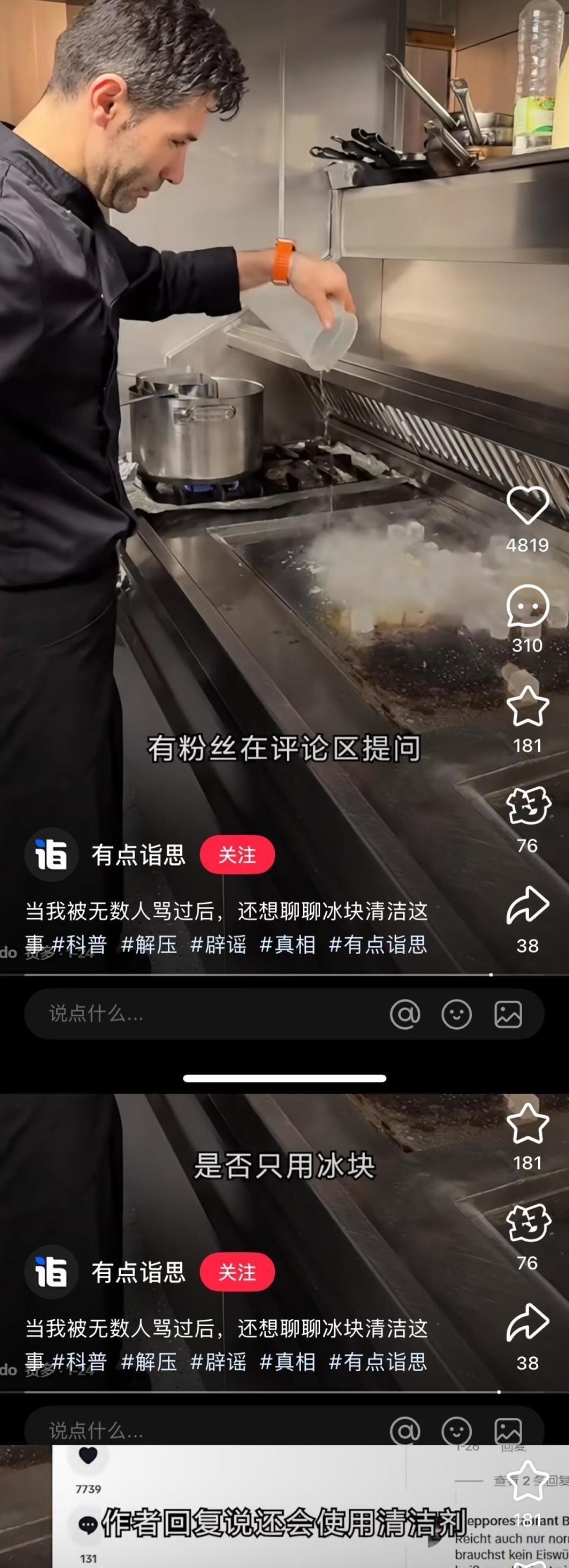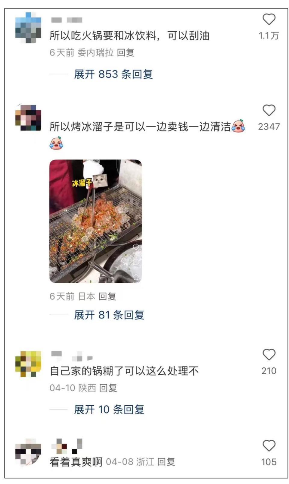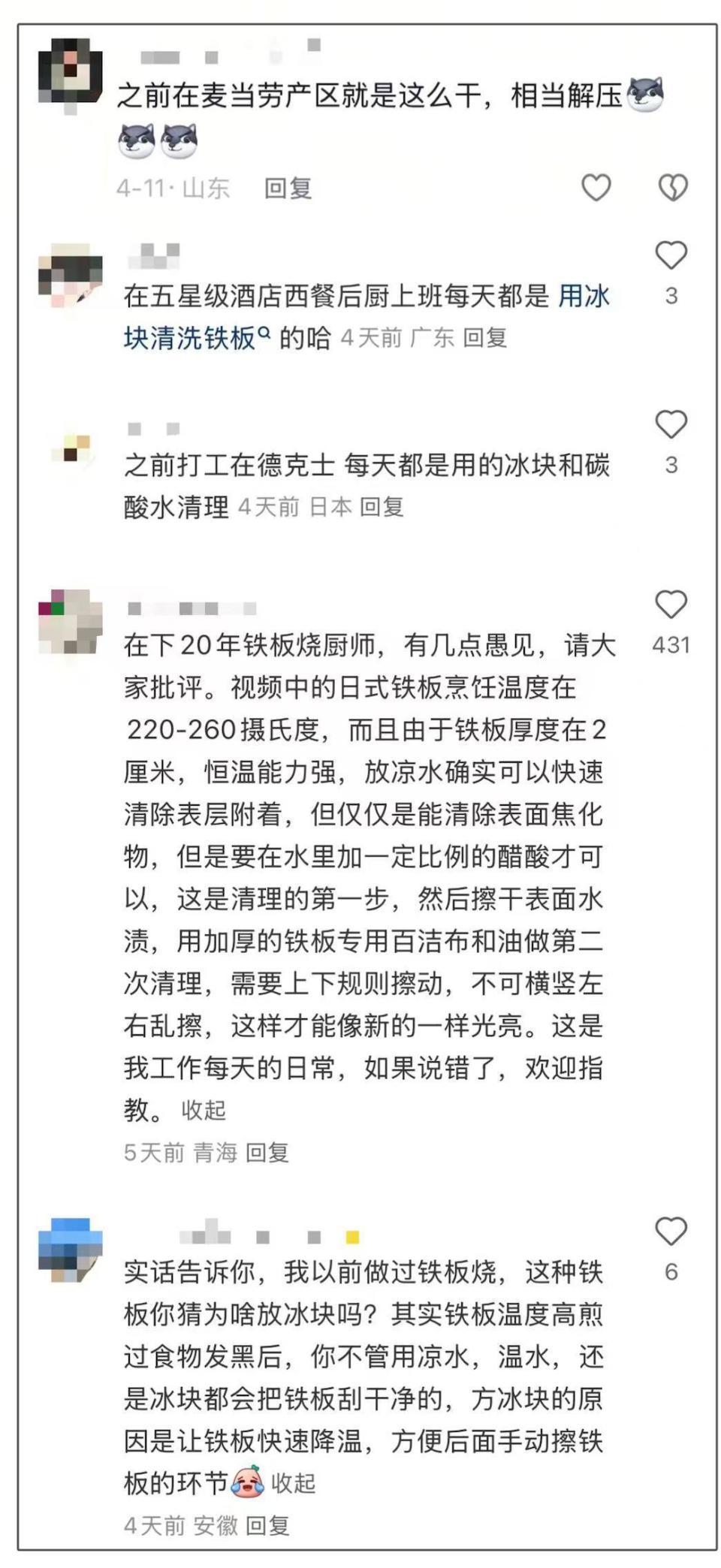 最后,不少网友还在评论区提醒,想要跟风“省点儿洗洁精”的朋友,非专业人士不要随意尝试,瞬间产生的高温蒸汽会有烫伤风险,长期使用冰块清洁,可能加剧铁板变形,也会减少煎锅使用寿命~