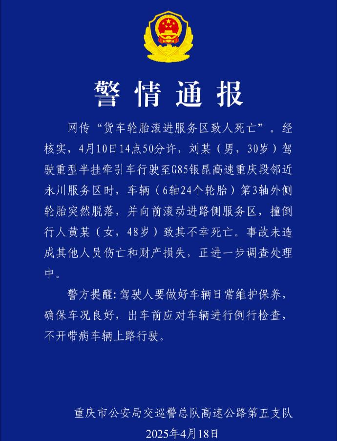 4月18日,重庆市公安局交巡警总队高速公路第五支队发布通报,网传“货车轮胎滚进服务区致人死亡”,经核实,4月10日14点50分许,刘某(男,30岁)驾驶重型半挂牵引车行驶至G85银昆高速重庆段邻近永川服务区时,车辆(6轴24个轮胎)第3轴外侧轮胎突然脱落,并向前滚动进路侧服务区,撞倒行人黄某(女,48岁)致其不幸死亡。事故未造成其他人员伤亡和财产损失,正进一步调查处理。4月18日下午,针对这一事件中存在的责任认定和法律风险问题,红星新闻记者采访了律师。