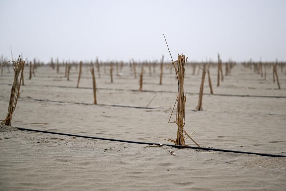 这是在新疆和田地区和田县阿和公路西侧群众治沙点拍摄的定杆作业后的沙枣苗(4月7日摄)。新华社记者 丁磊 摄