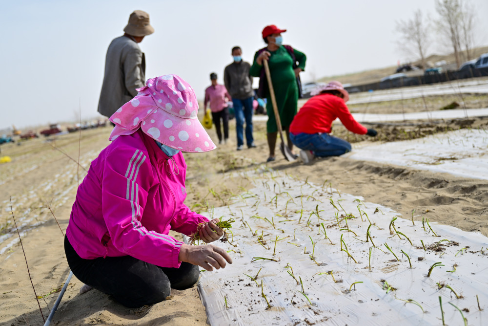 在新疆和田地区民丰县防沙治沙试验站,工作人员在沙地种植洋葱(4月8日摄)。新华社记者 丁磊 摄