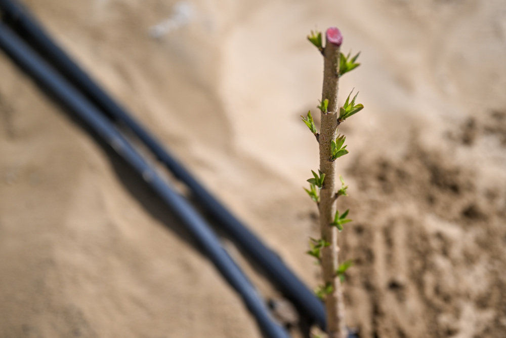 在于田县西和公路西侧,2024年11月28日塔克拉玛干沙漠“锁边工程”合龙点,玫瑰花苗已经吐绿,一条条铺设齐整的滴灌带延伸向远处。