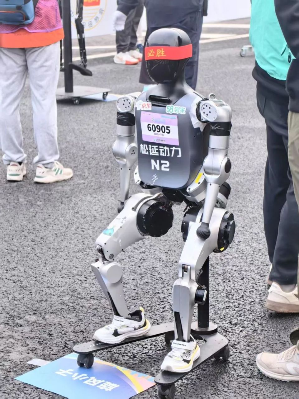现场,旋风小子队参赛选手松延动力N2机器人足登斯凯奇运动鞋,头缠“必胜”红巾。记者了解到,此次参赛的松延动力N2身高120cm,体重30kg,研发设计过程中突破传统步态束缚,能在高速奔跑中保持稳定性和灵活性。奔跑过程中通过实时调整步频、步幅和着地角度,确保高速状态下的动态平衡。