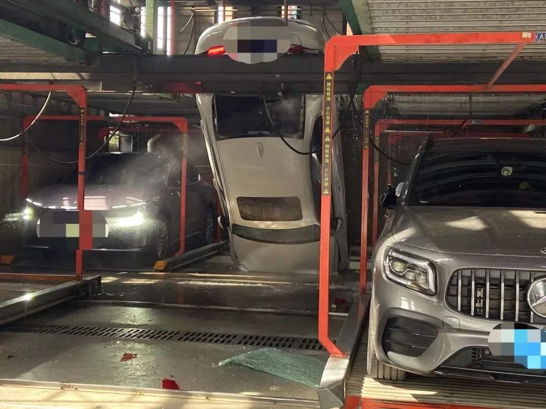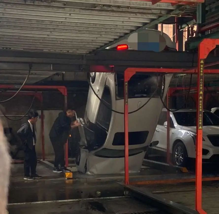 被车库支架撑着才没有倒下来,立体车库上层的铁板已经垂落下来,车身四周有水喷出,左右均有停放的其他车辆。