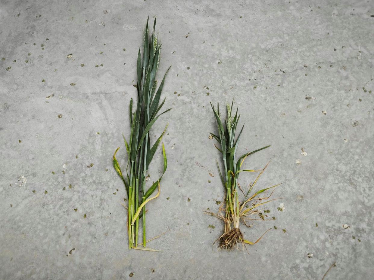 ▲正常浇灌的小麦和未浇灌的小麦长势对比