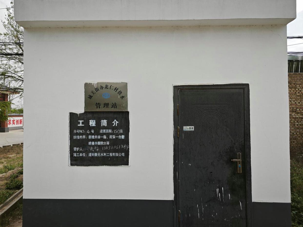 邱云锋是北仁村4号井的管护人,他称其管理这口井大约30年时间,主要用于村内四队村民的农业灌溉。“自从这井打下了,我就一直在管着。”在4号井水泵房的墙面张贴着工程简介,显示4号井灌溉面积为150亩,维修内容为新建井房一座、配泵一台、维修井圈等,管护人为邱云锋,并挂有城关街办北仁村供水管理站的标牌。