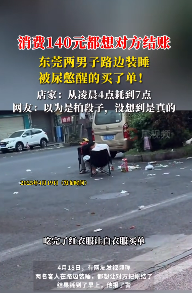 4月18日,有网友发视频称,两名客人在路边装睡,都想让对方把帐结了,结果耗到了早上,他报了警。