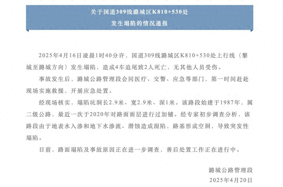 据央视新闻消息,4月20日,山西省潞城公路管理段发布通报,4月16日凌晨1时40分许,国道309线山西省长治市潞城区K810+530处上行线(黎城至潞城方向)发生塌陷,造成4车追尾致2人死亡,无其他人员受伤。