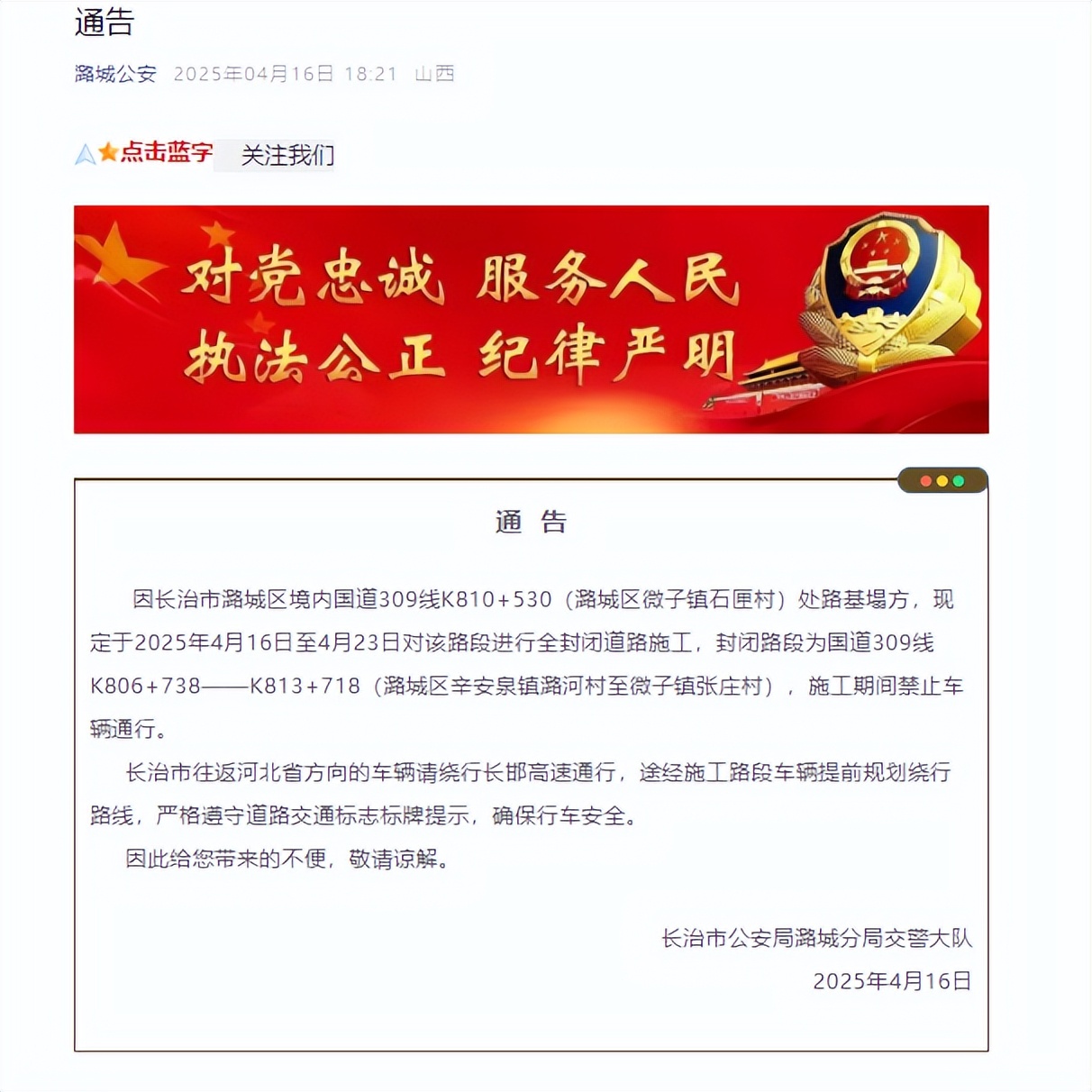 4月16日下午6时21分,长治市公安局潞城分局交警大队发布通告称,因长治市潞城区境内国道309线K810+530(潞城区微子镇石匣村)处路基塌方,4月16日至4月23日对该路段进行全封闭道路施工,施工期间禁止车辆通行。长治市往返河北省方向的车辆,请绕行长邯高速通行,请途经该路段车辆提前规划绕行路线,严格遵守道路交通标志标牌提示,确保行车安全。