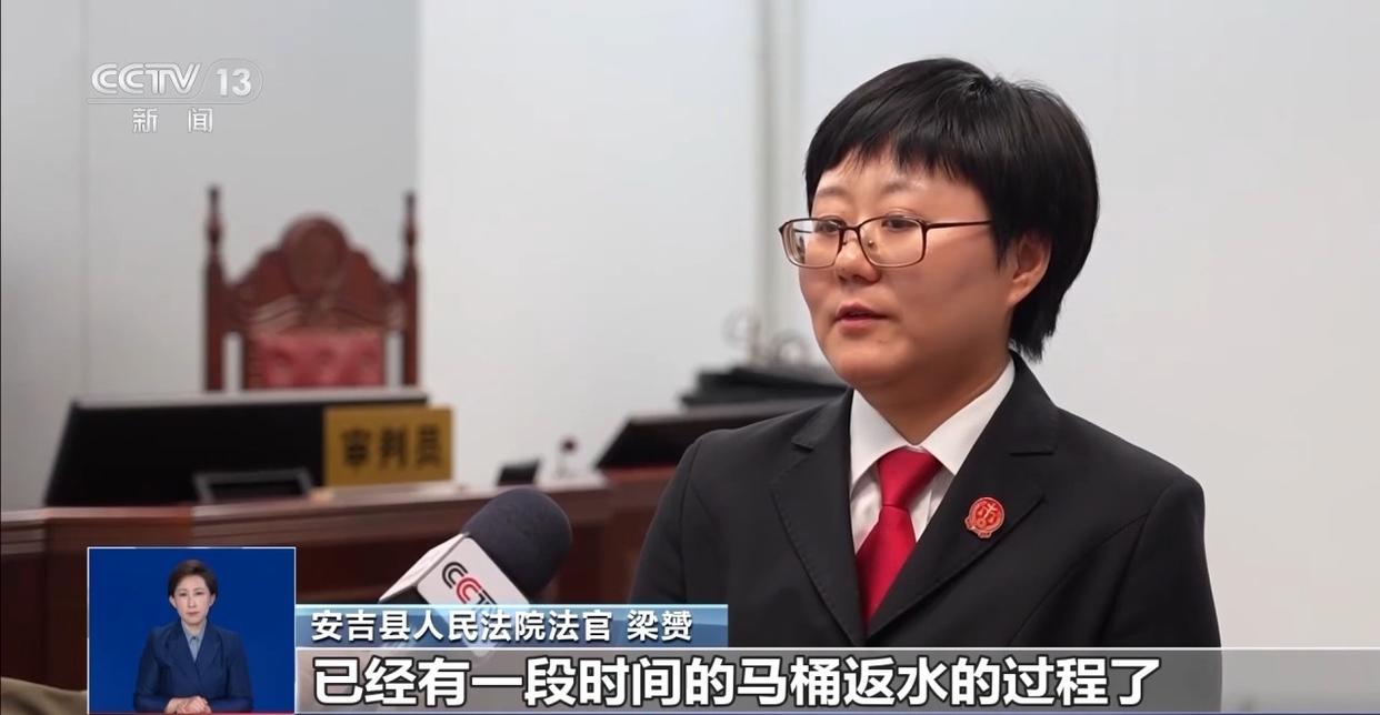 浙江省安吉县人民法院法官 梁赟:因为管道的堵塞,其实它也不是一天两天的事情,通常来讲是一个长期积累的过程,我们去看的时候,污水已经有五六厘米深了,可能也是好几天了,肯定也不是一天两天的事情,已经有一段时间的马桶返水的过程了。