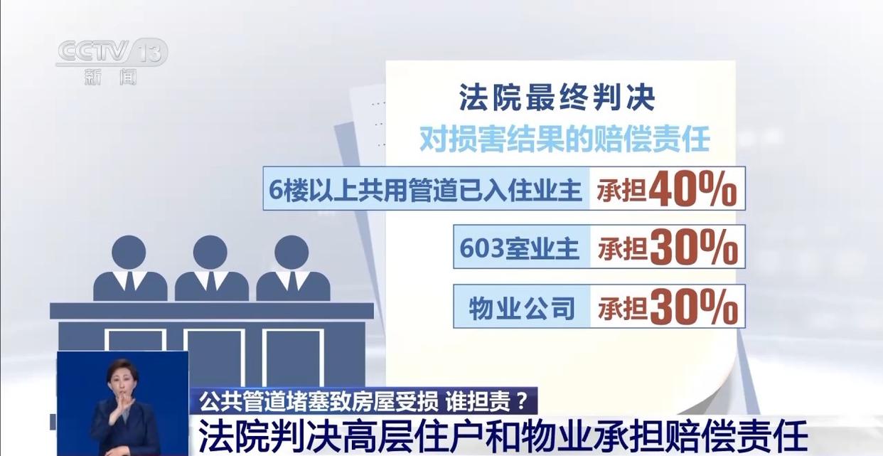 法院审理认为,原告所举证据不足以证明房地产开发公司在下水管设计、施工等过程中存在过错,房地产开发公司不承担赔偿责任。法院最终判决,6楼以上共用管道已入住业主,603室业主以及物业公司对损害结果分别承担40%、30%、30%的赔偿责任。宣判后,案件当事人均服判息诉,相关当事人已自动履行赔偿义务。