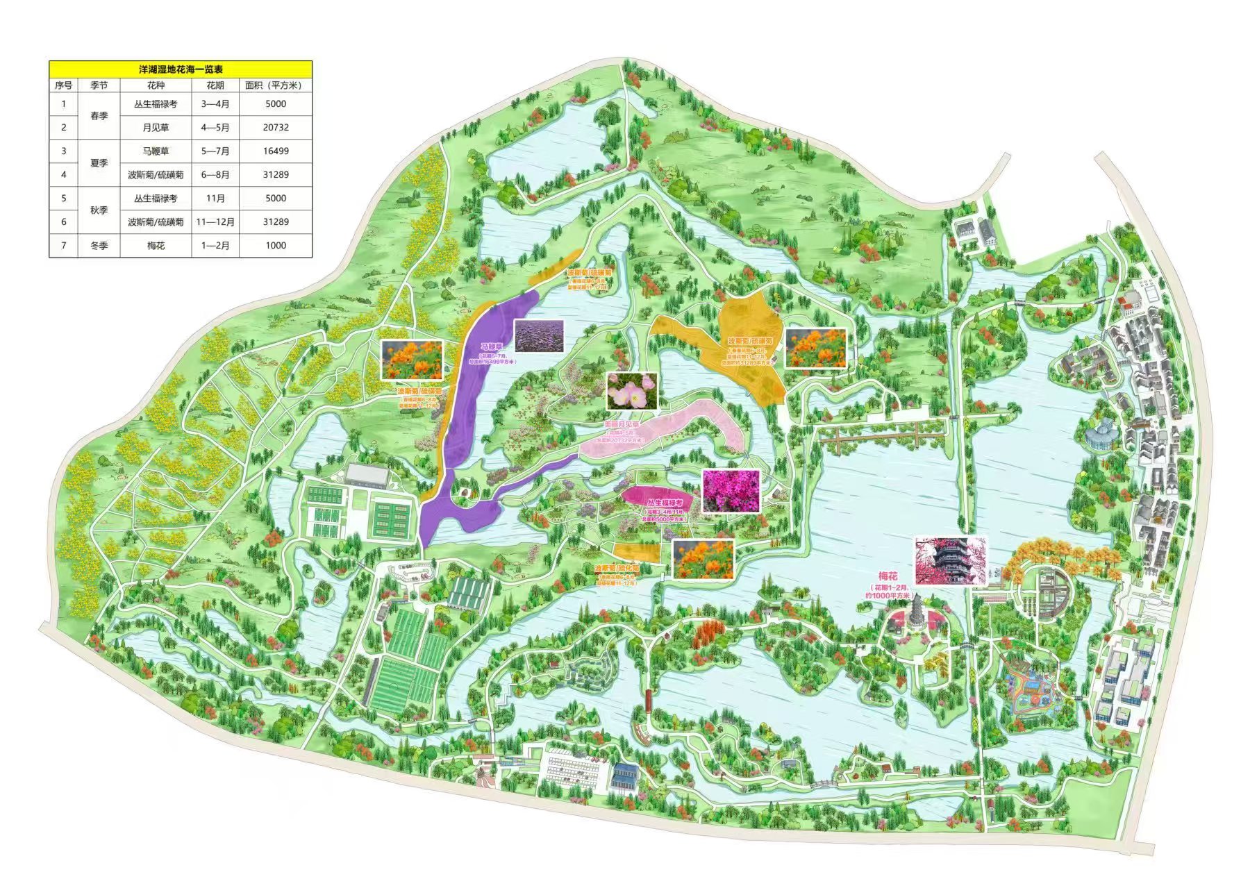 △园区工作人员给出的不同花海区域图,图中显示1至12月均有不同鲜花盛开。图/受访者提供