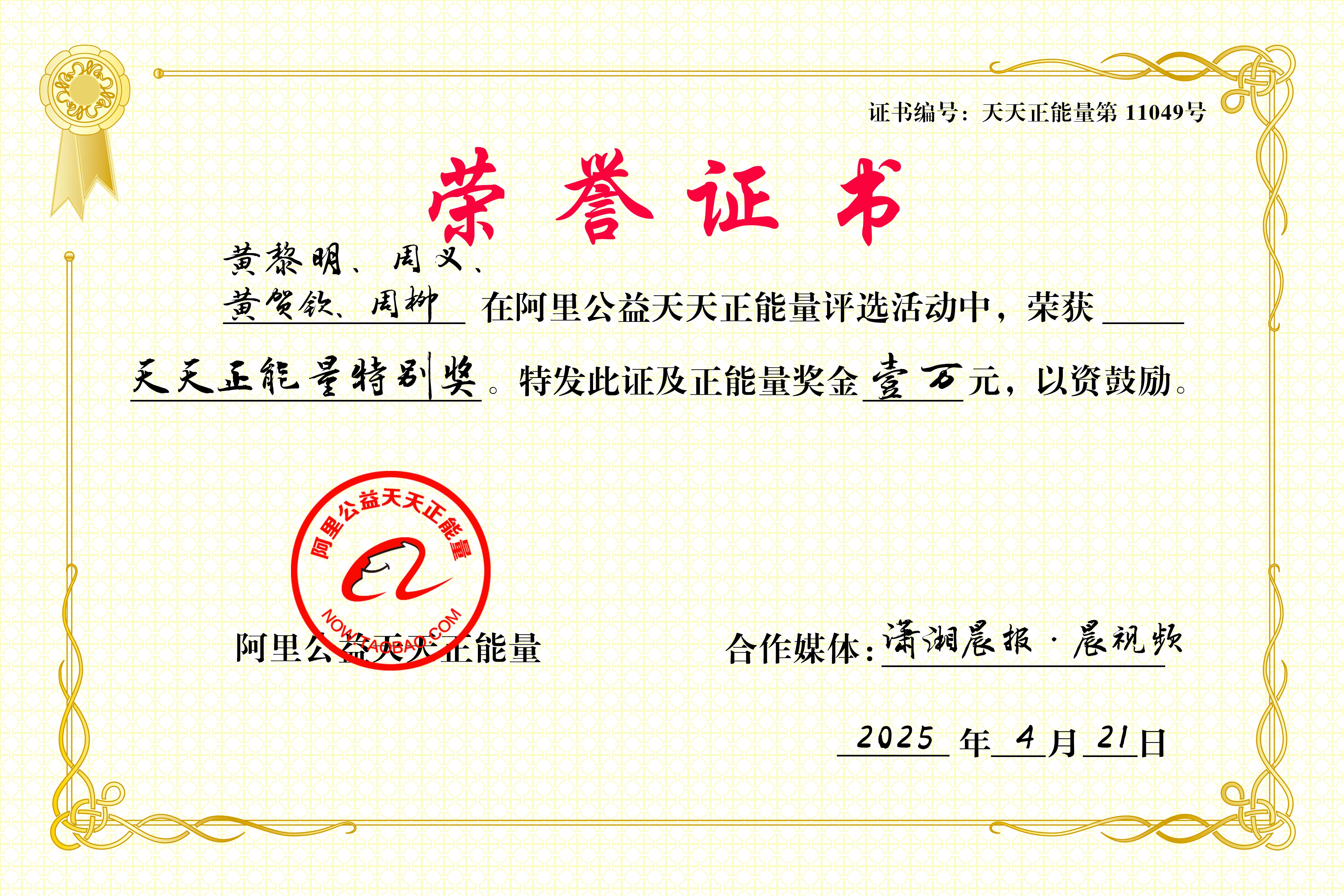 4月19日,阿里公益天天正能量联合潇湘晨报·晨视频,为黄黎明、周义、黄贺钦、周柳颁发正能量特别奖及奖金10000元。