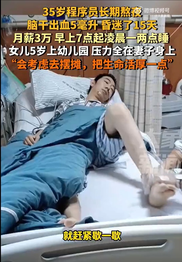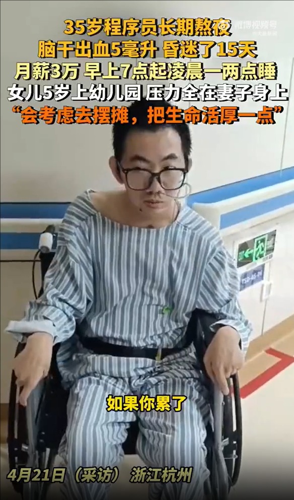 据海报新闻4月21日报道,浙江杭州,35岁程序员近日因长期熬夜脑干出血5毫升,昏迷15天,#程序员凌晨睡7点起脑干出血昏迷15天# 话题随之登上热搜。