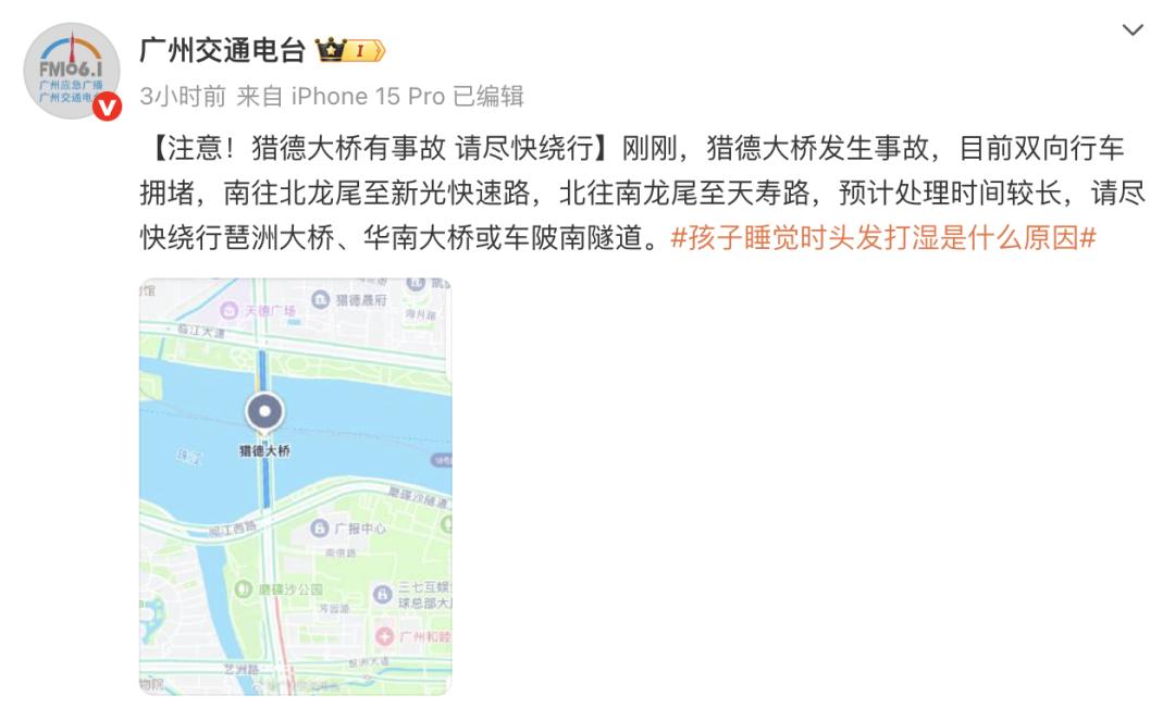 22日早上,广州交通电台发文:“刚刚,猎德大桥发生事故,目前双向行车拥堵,南往北龙尾至新光快速路,北往南龙尾至天寿路,预计处理时间较长,请尽快绕行琶洲大桥、华南大桥或车陂南隧道。”