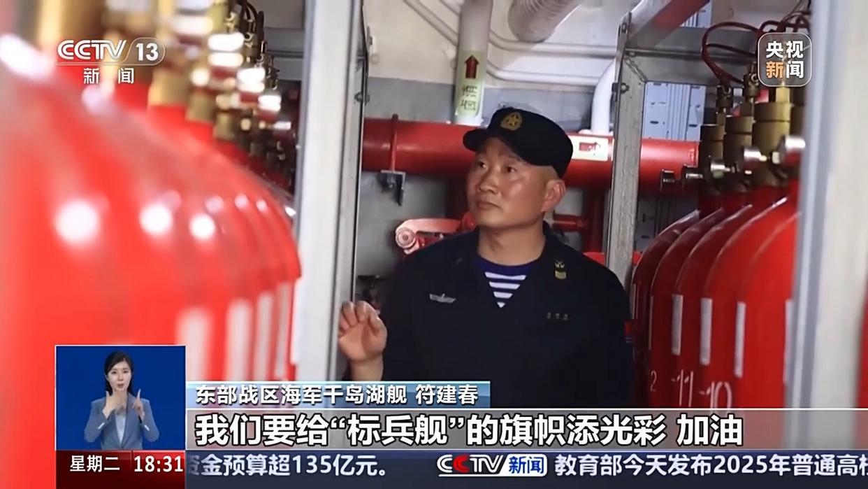 东部战区海军千岛湖舰 符建春:第一个人员的素质能跟得上,第二个人员的维修的能力能跟得上,虽然我们的舰比较老,但是人员的技术能力能维持舰正常运行;我们还有个“标兵舰”的信念,因为“标兵舰”是我们的信念,我们要给标兵舰的旗帜添光彩、加油。