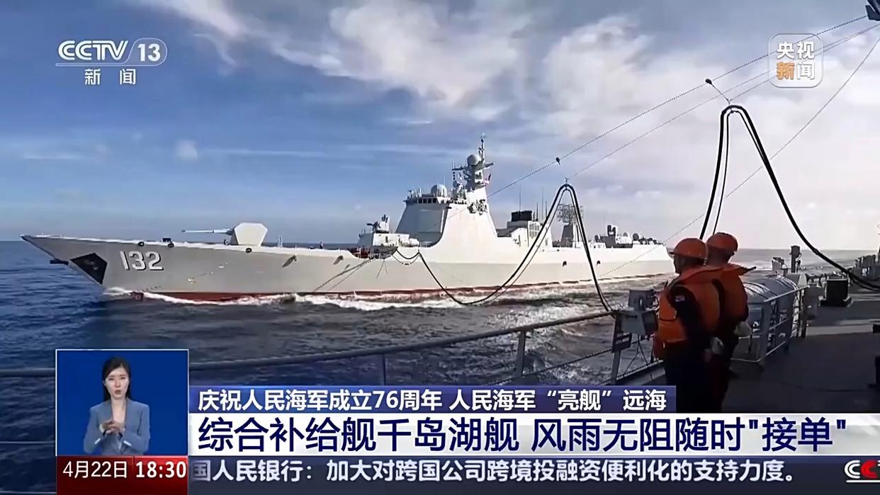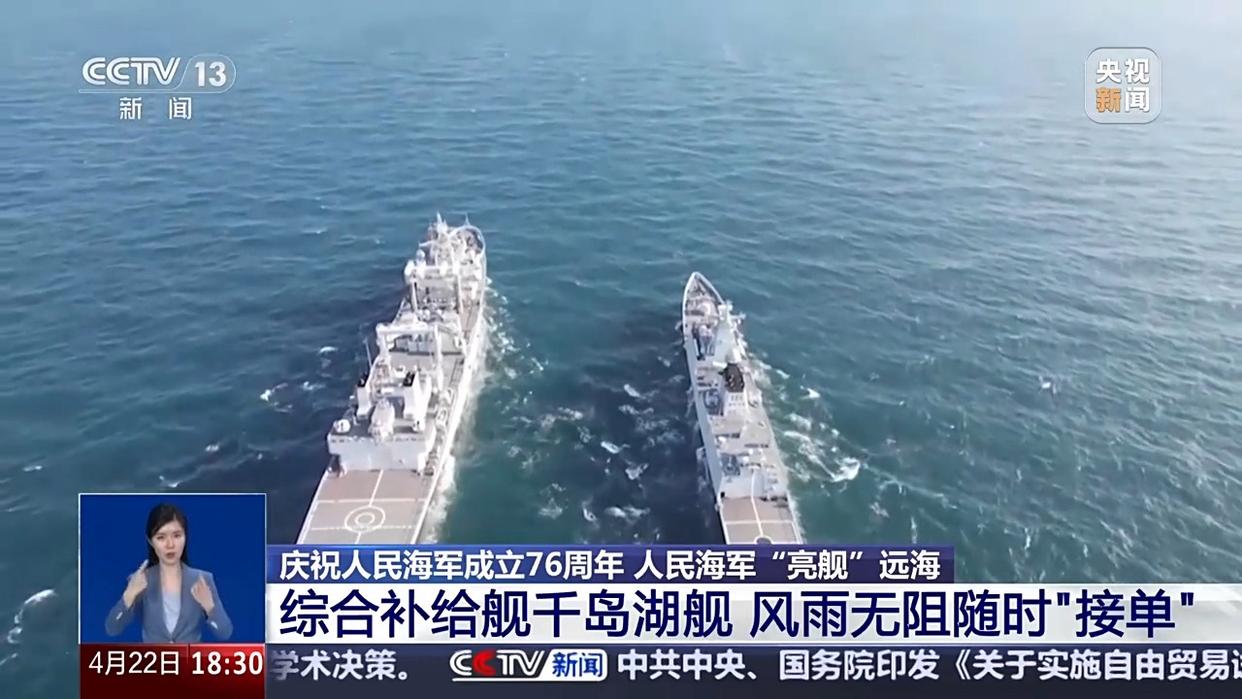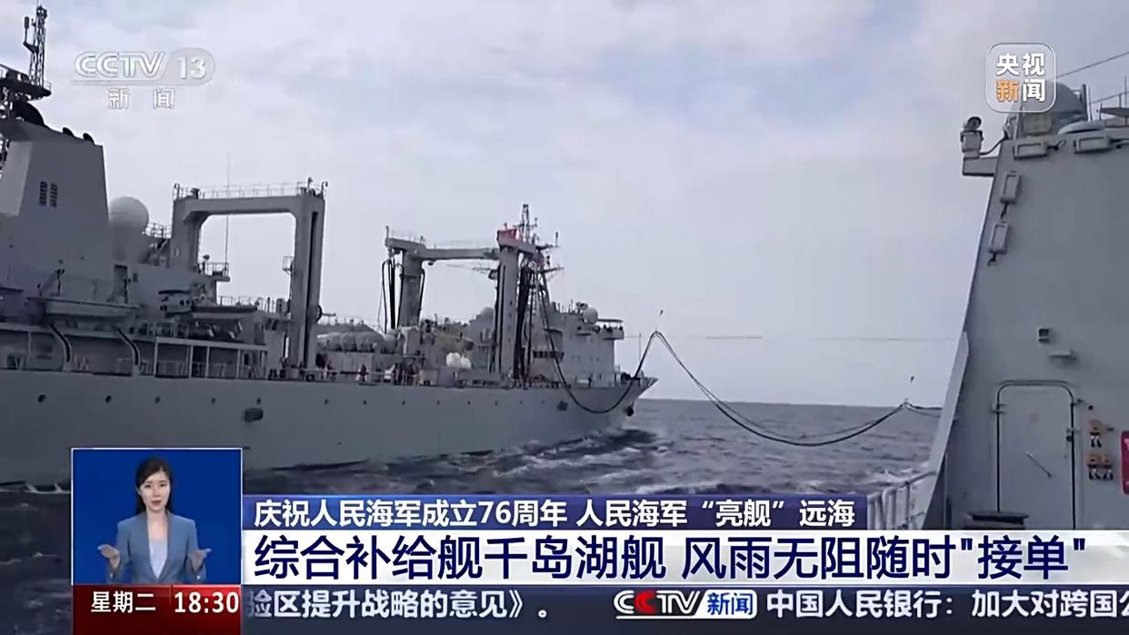 “亮舰”远海的还有综合补给舰千岛湖舰 。“兵马未动,粮草先行”,一次次演训任务成功的背后离不开有力的后装保障。综合补给舰是专门承担海上补给任务的海军作战支援舰艇,它犹如一座伴随保障的海上移动仓库,默默为舰艇编队提供全方位后勤保障,支撑编队勇闯大洋,被网友亲切称为“海上奶妈”。“远洋补给标兵舰”千岛湖舰就是其中一员,服役21年来,像外卖员一样,风雨无阻,随时接受各种“点单”。