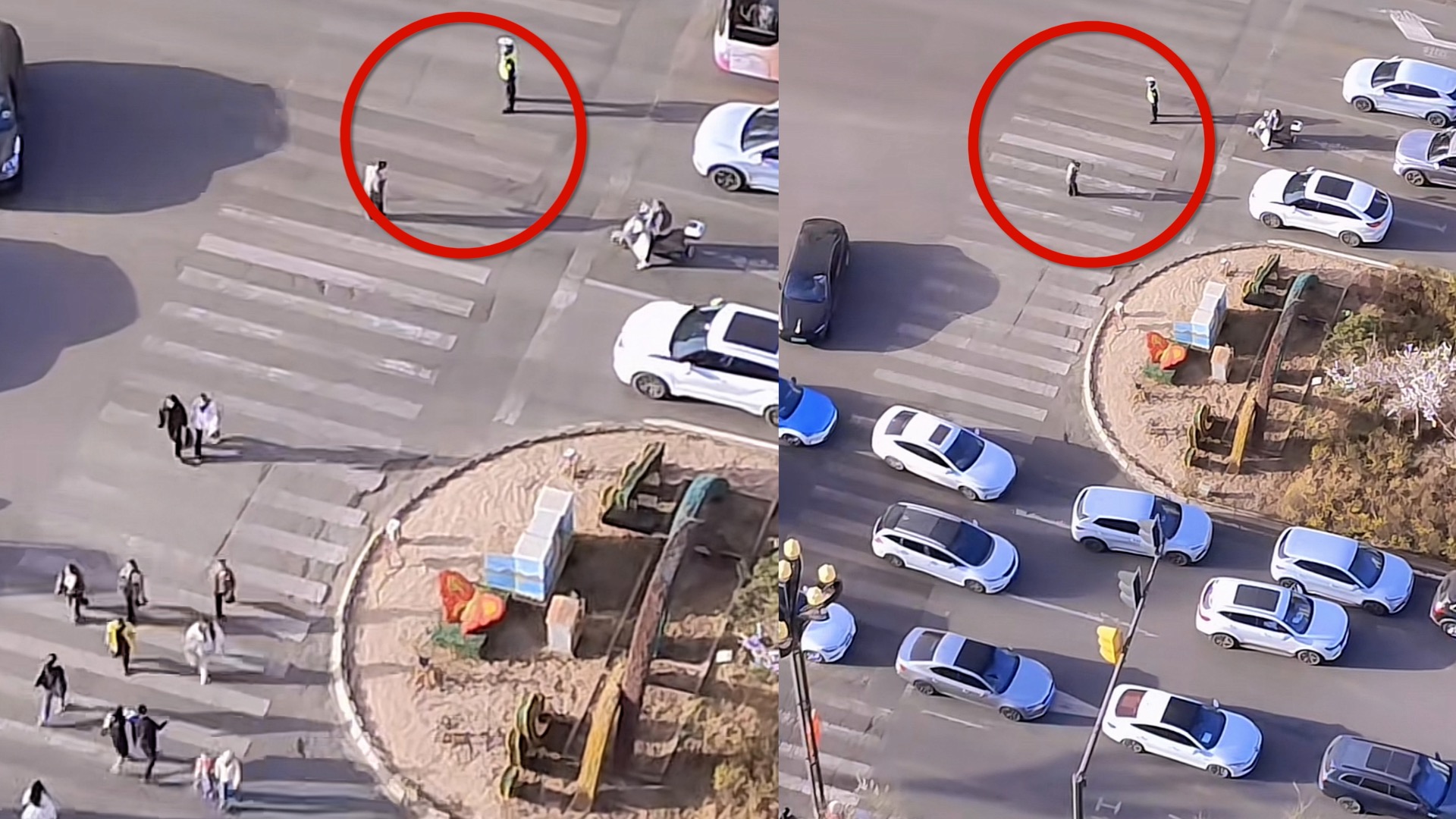 在车海人流中,王克宁一人组成“人墙”护送行动不便老人过马路。网络截图。