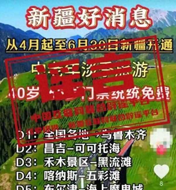 真相:近日,内容为“从4月起至6月30日新疆各大5A级景区门票统统免费”的信息在多个新媒体平台流传,引发网民关注。经向有关景区核实,均未实行类似优惠政策,此类信息涉嫌个别旅行社利用自媒体平台发布不实信息,误导消费者,严重扰乱旅游市场秩序。