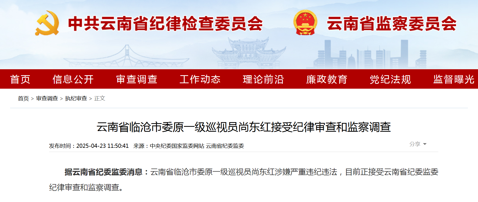云南省临沧市委原一级巡视员尚东红涉嫌严重违纪违法,目前正接受云南省纪委监委纪律审查和监察调查。