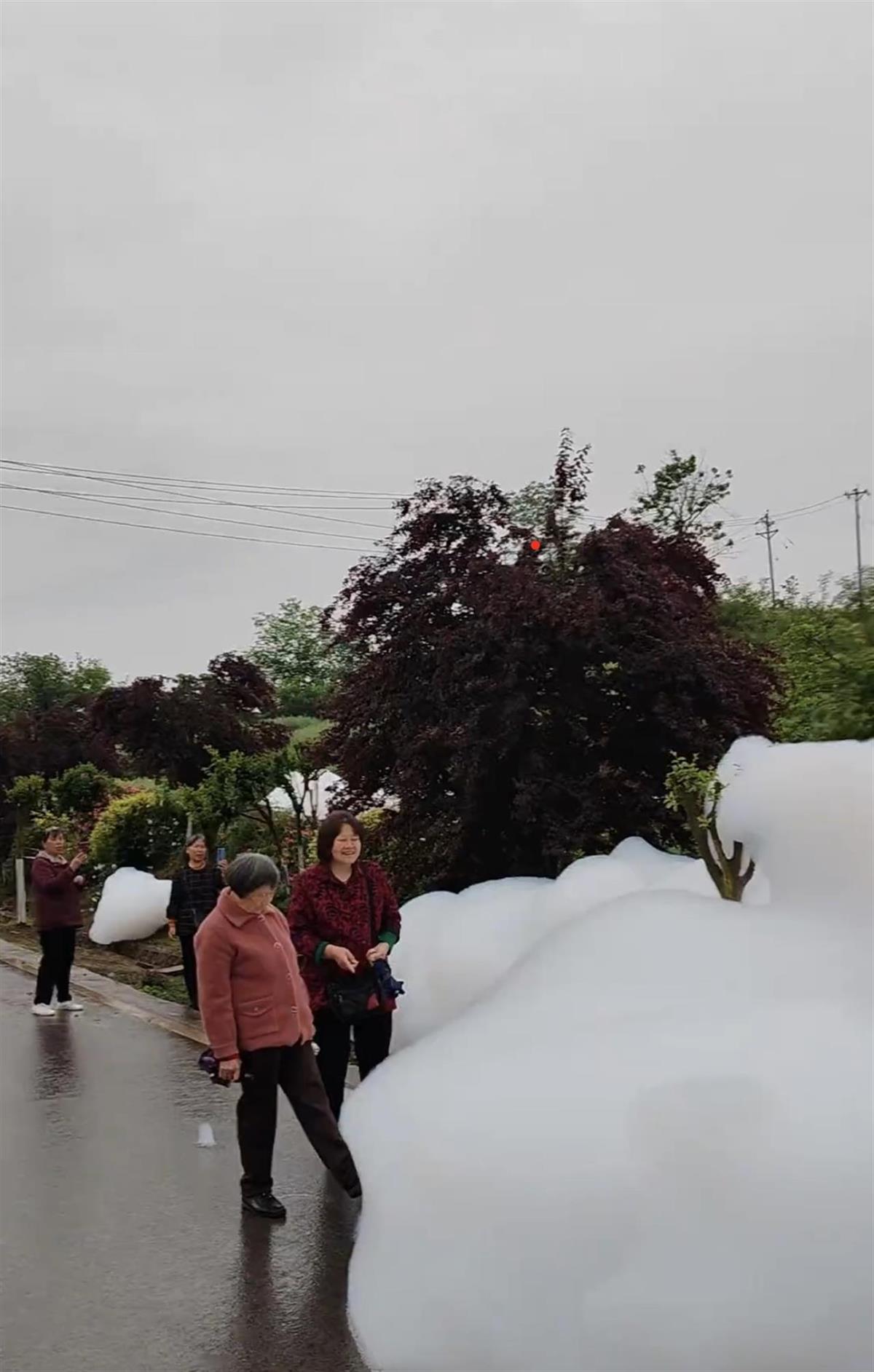 当地居民发布的视频显示,白色泡沫沿水沟和田间漫布,一团一团的,大的有三四米高。25日上午,一村民告诉极目新闻记者,当天他一早出门就发现了泡沫,沿沟渠的田边到处都是,闻起来有淡淡的腥味,抓在手中就像洗衣粉的泡沫,一会就会化掉了。