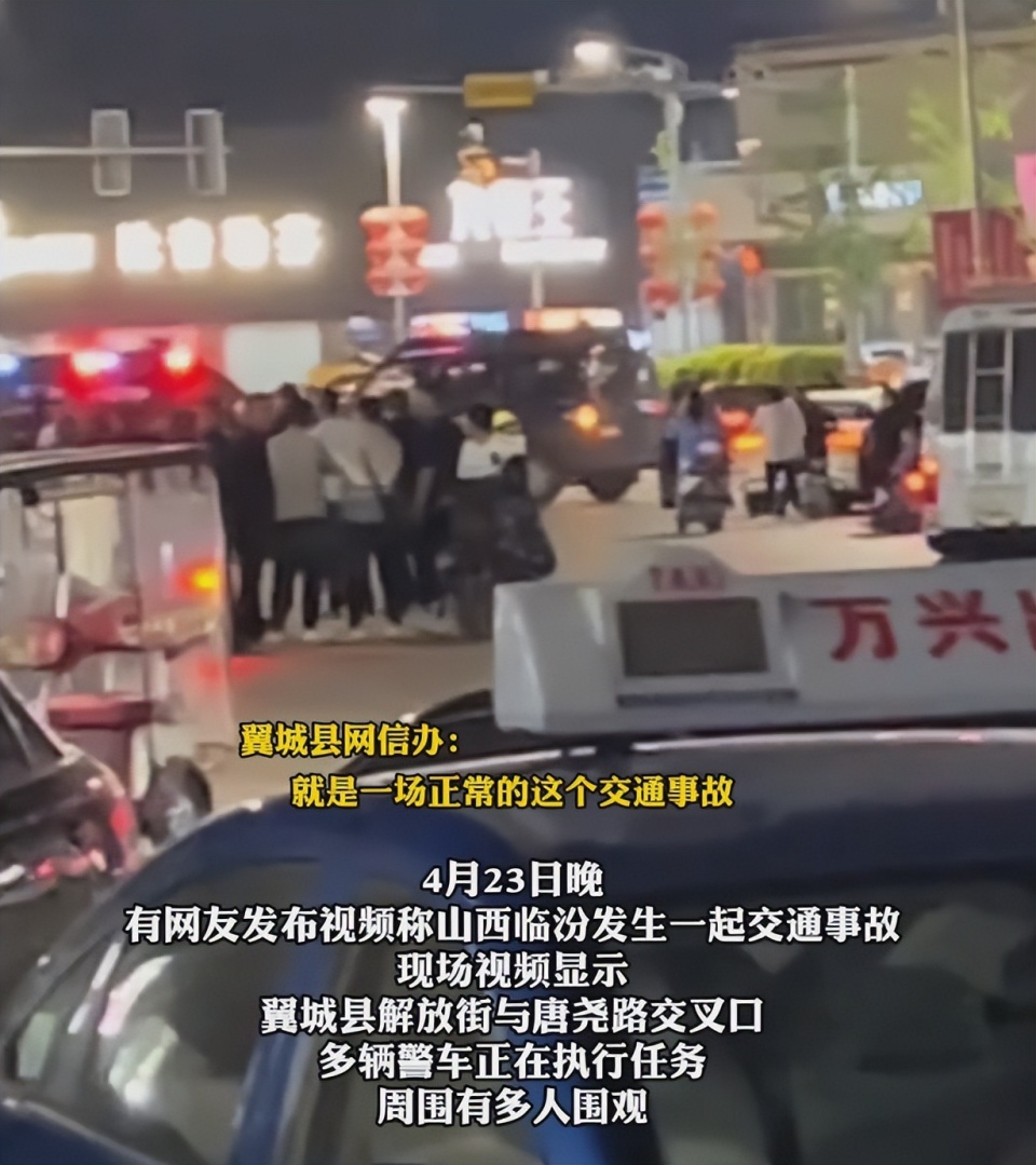 4月23日晚,有网友发布视频称山西省临汾市翼城县发生一起交通事故。现场视频显示,翼城县解放街与唐尧路交叉口多辆警车正在执行任务,周围有多人围观。