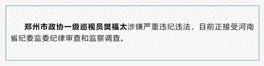 郑州市政协一级巡视员樊福太涉嫌严重违纪违法,目前正接受河南省纪委监委纪律审查和监察调查。