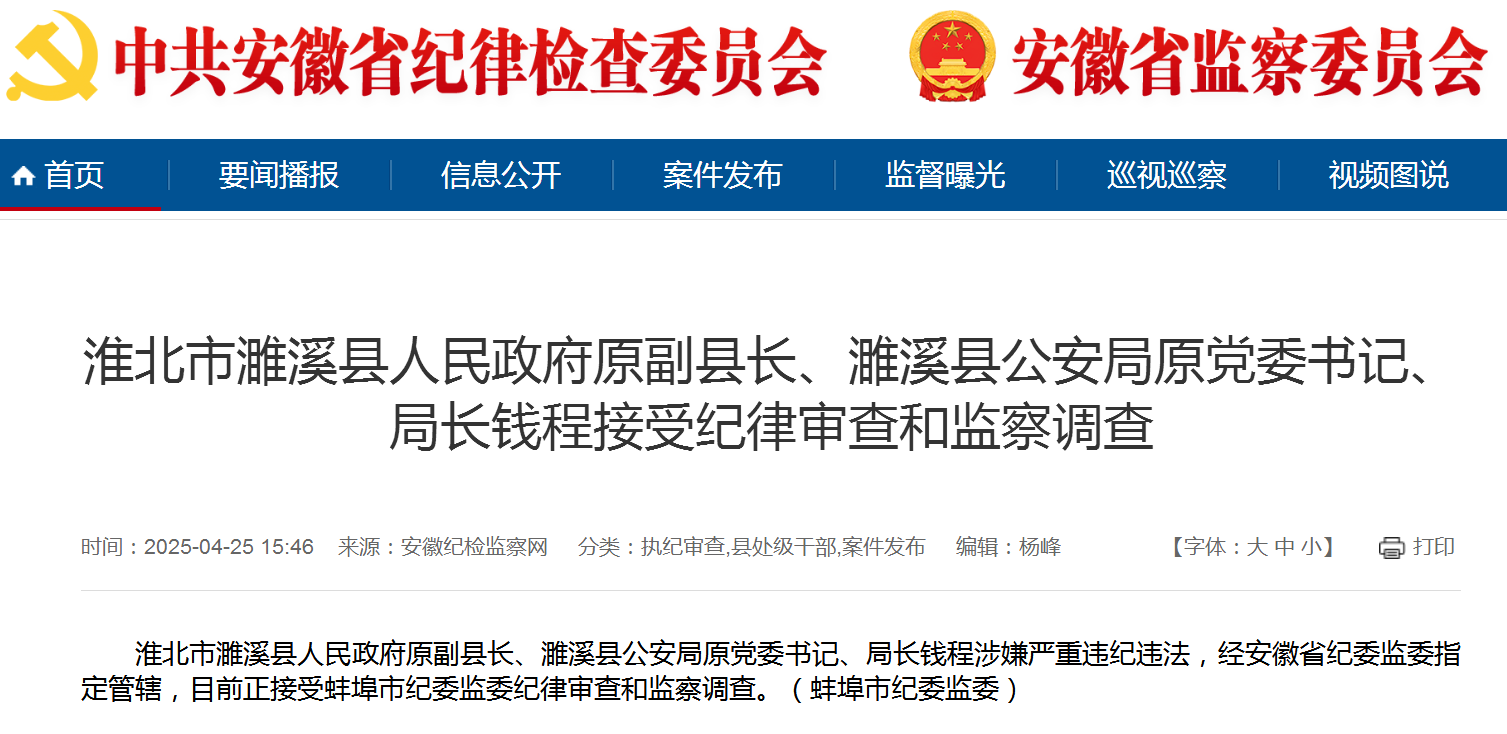 淮北市濉溪县人民政府原副县长、濉溪县公安局原党委书记、局长钱程涉嫌严重违纪违法,经安徽省纪委监委指定管辖,目前正接受蚌埠市纪委监委纪律审查和监察调查。(蚌埠市纪委监委)