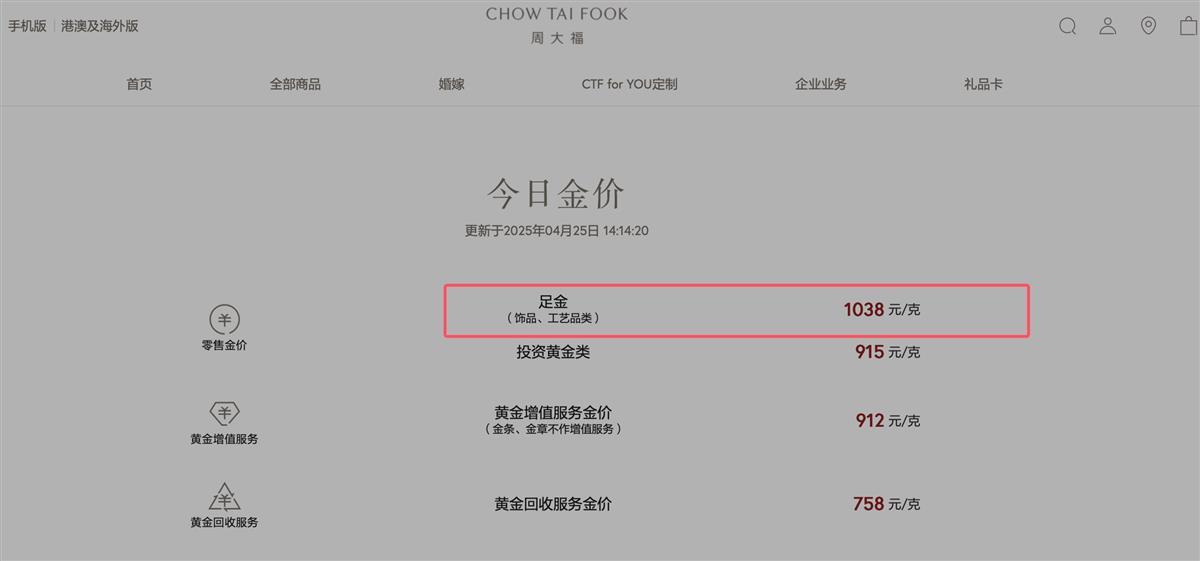 而就在本月,国内多个金饰品牌的金饰单价突破每克1000元。4月25日,在周大福官网上,足金(饰品、工艺品类)为每克1038元。