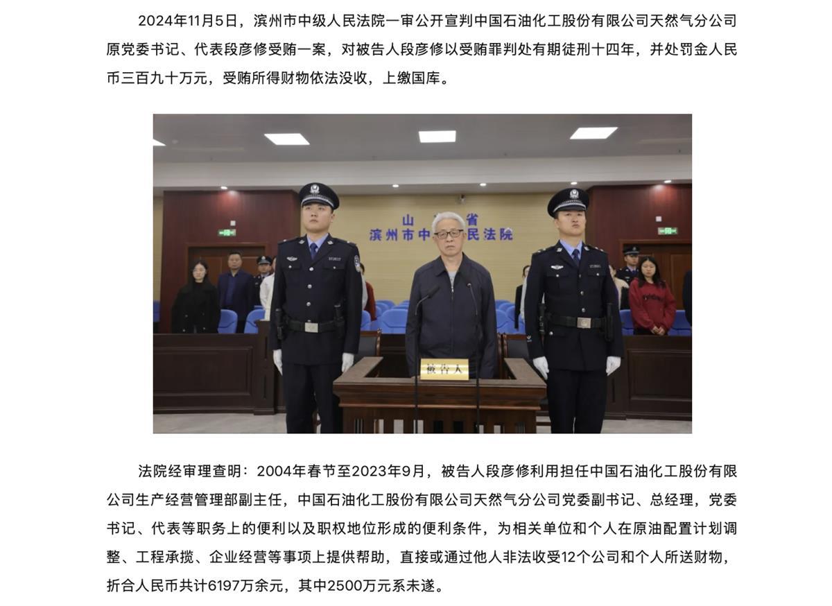 段彦修是谁?记者通过山东省高级人民法院微信公众号获悉,其系中国石油化工股份有限公司天然气分公司原党委书记、代表。去年11月5日,滨州市中级人民法院一审公开宣判段彦修受贿一案,其因受贿罪被判处有期徒刑十四年,并处罚金人民币三百九十万元,受贿所得财物依法没收,上缴国库。